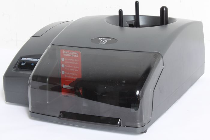 Microboards G3 Inkjet Autoprinter, Automated 50-Disc printer Description : The Microboards G3 injet disk autoprinter eonomically and professionally prints CDs, DVDs, or even Blu-ray Discs from its perch on your desktop. An integrated HP inkjet technology printer produces vibrant images up to 4800DPI using a single tri-color cartridge (GX-300-HC). With a sleek 50-disc input and fully-enclosed output bin, the G3 disc printer's small footprint allows disc printing to take place in even the smallest of offices. For recording and printing discs, please see the Microboards G3 Disc Publisher 50-Disc Auto-Duplicator/Printer. Part No. G3A-1000Disc Input: 50Typical Weekly Throughput: 25-100 DiscsInk Cartridges: Single Cartridge: GX-300 HCPrinting Technology: HP thermal inkjet Cost per Disc: About 23 cents per disc (full-color, full-coverage)Print Resolution: Up to 4800 dpi Label Design Software: SureThing (PC), Disc Label (Mac)